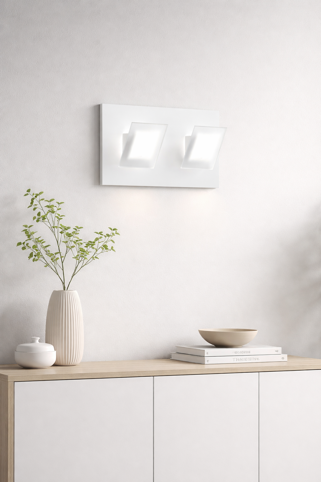Aplique rectangular de 2 luces LED en color blanco, con diseño moderno y minimalista que brinda una iluminación uniforme y eficiente. Ideal para baños, cocinas, dormitorios, livings, oficinas o vestíbulos, aportando un estilo simple y elegante.