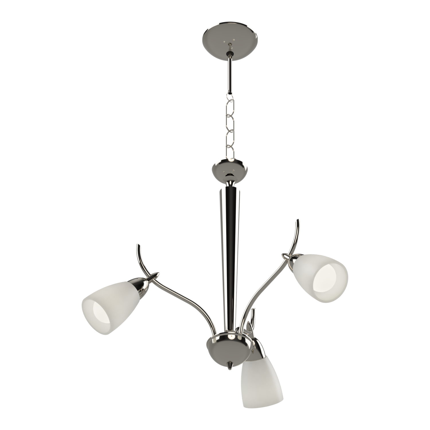 Araña elegante con estructura cromada y tres tulipas de vidrio satinado que ofrecen una iluminación cálida y suave. Ideal para aportar estilo y luz ambiental en espacios interiores.