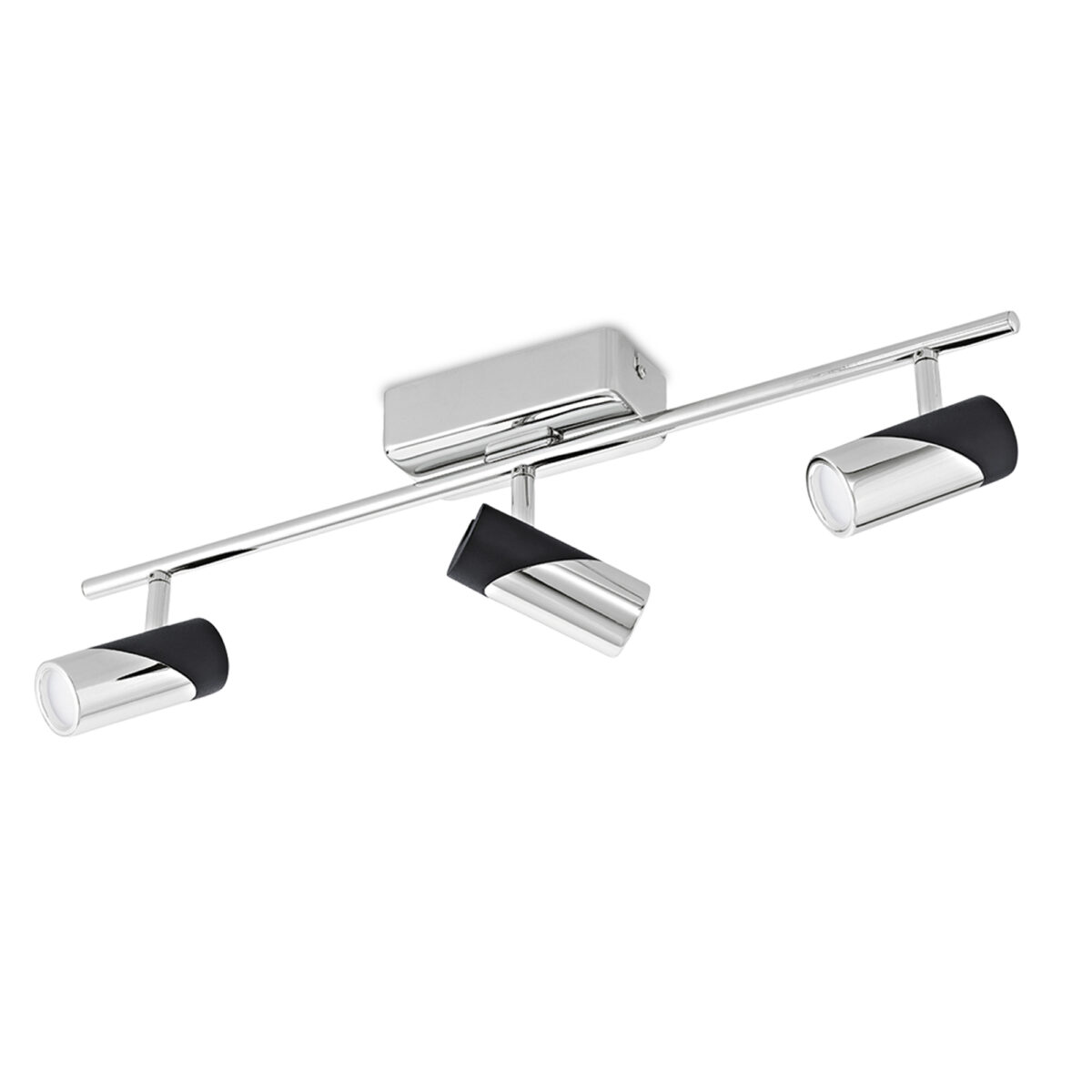 Sistema de 3 luces con acabado en cromo y detalles en negro, equipado con spots dirigibles que permiten orientar la luz según necesidad. Su diseño moderno y funcional es ideal para espacios como baños, cocinas o dormitorios, ofreciendo iluminación focalizada y estética contemporánea.