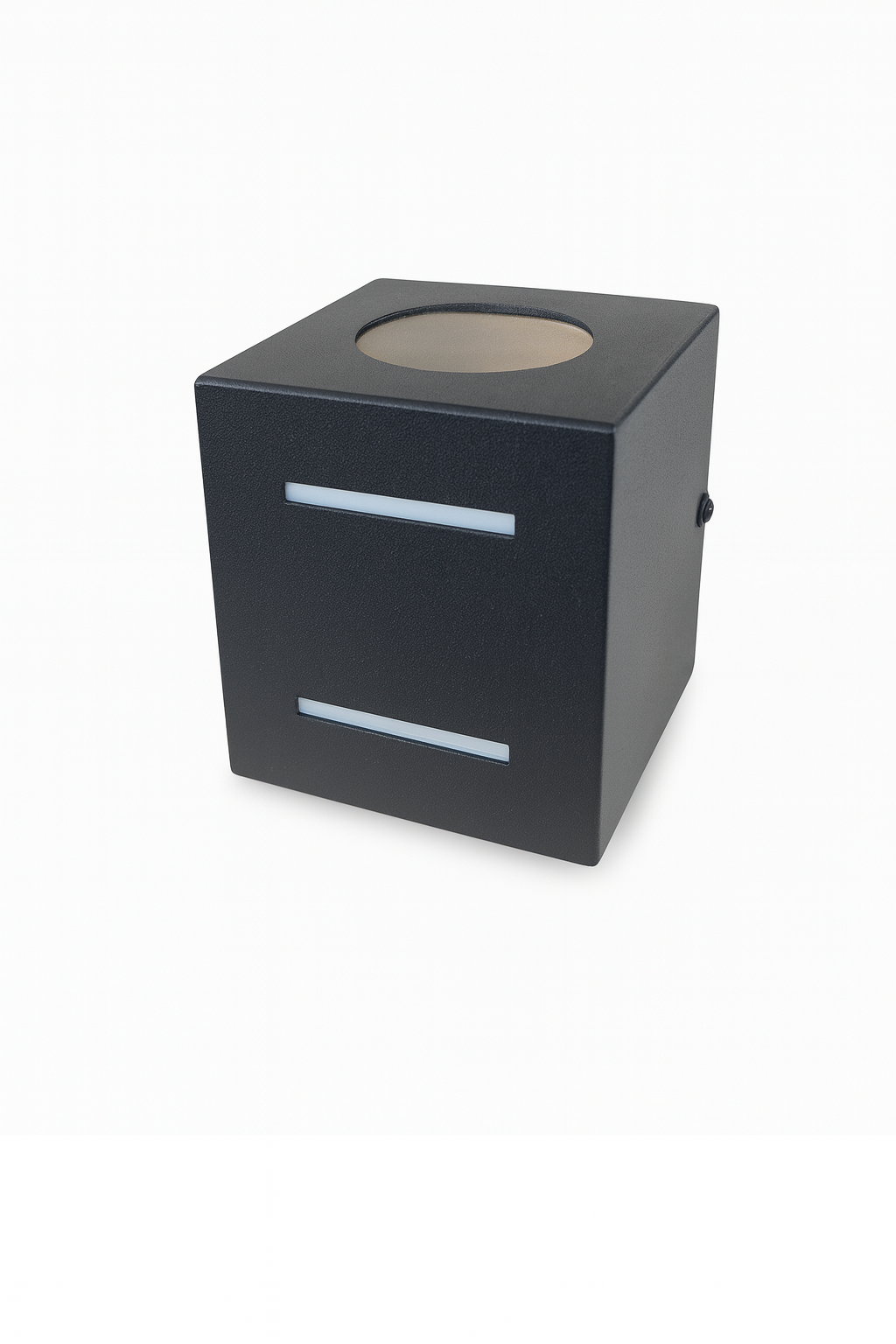 Aplique bidireccional de exterior diseñado para iluminar hacia arriba y hacia abajo, creando un efecto moderno y atractivo sobre paredes y fachadas. Su estructura metálica ofrece resistencia y durabilidad frente a la intemperie, mientras que su diseño compacto se adapta a todo tipo de estilos arquitectónicos. Ideal para realzar entradas, galerías, patios y espacios exteriores con una luz elegante y funcional.
