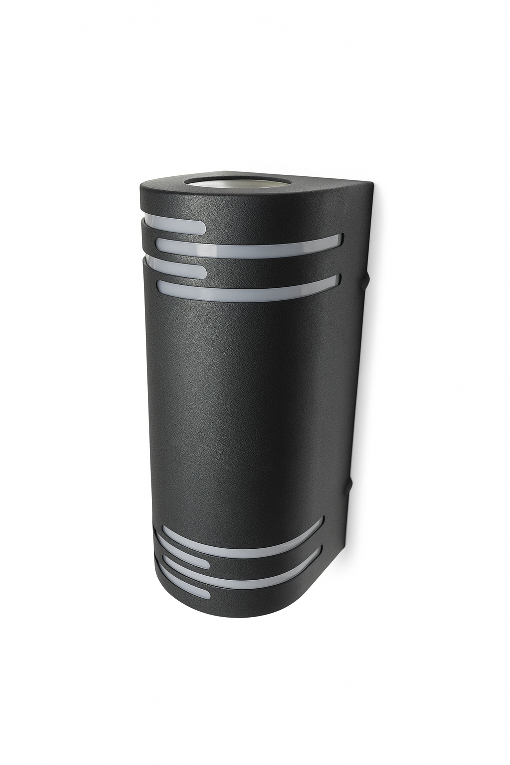 Aplique bidireccional metálico con diseño bombeado, ideal para iluminar hacia arriba y hacia abajo mediante dos lámparas GU10. Su forma curva aporta un estilo moderno y decorativo, generando un efecto de luz atractivo sobre muros y fachadas. Gracias a su construcción resistente, es una excelente opción para exteriores donde se busca estética, funcionalidad y durabilidad.