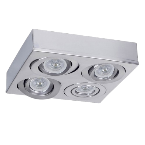 Plafón cardánico rectangular de 2 luces para lámparas LED GU10. Con cabezales orientables y estructura de acero, permite direccionar la luz con precisión, ideal para iluminación puntual y decorativa.
