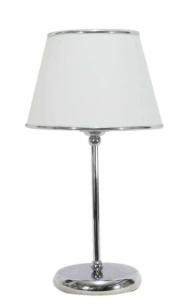 Lámpara de mesa de diseño elegante con pantalla cónica de tela lino. Terminación en cromo, ideal para aportar calidez y estilo a cualquier ambiente.