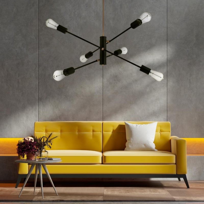 Colgante de 6 luces con lámparas E27 a la vista y diseño estilo vintage. Brazos móviles en acabado negro con detalles en cobre, ideal para sumar carácter y calidez. Altura regulable.