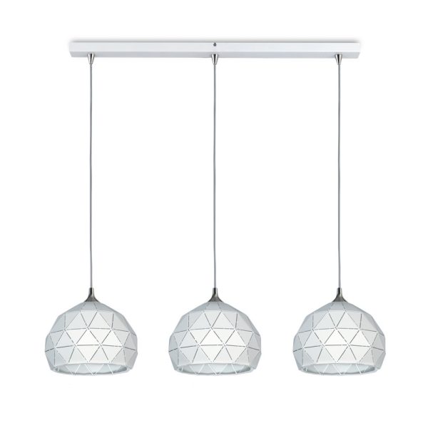 Los colgantes Bari tienen formas geométricas y pantallas caladas, fabricados en chapa con terminación en blanco .