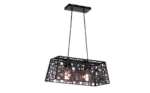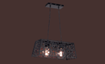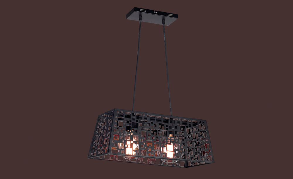 Colgante decorativo de chapa tipo pirámide calada, diseñado para dos lámparas LED con portalámparas E27. Su estructura metálica en color negro ofrece un estilo moderno e industrial, ideal para ambientes como cocinas, livings, bares o espacios comerciales. La pantalla piramidal genera una iluminación focal cálida y agradable, mientras los calados proyectan un efecto lumínico decorativo en paredes y techos.