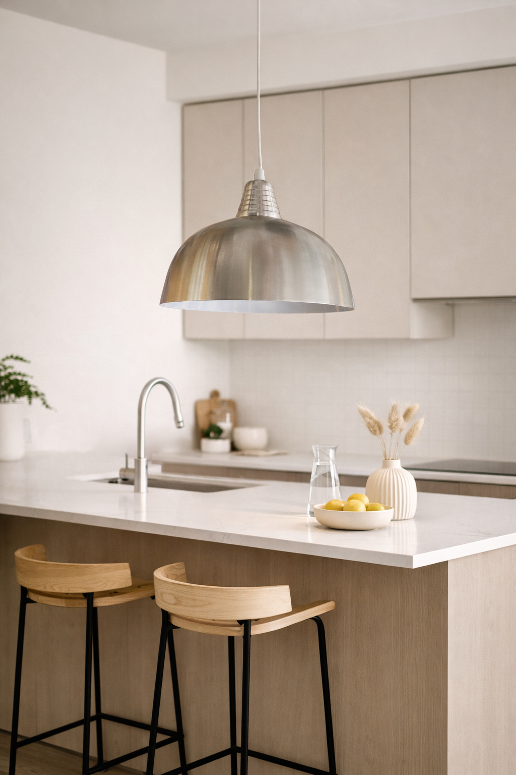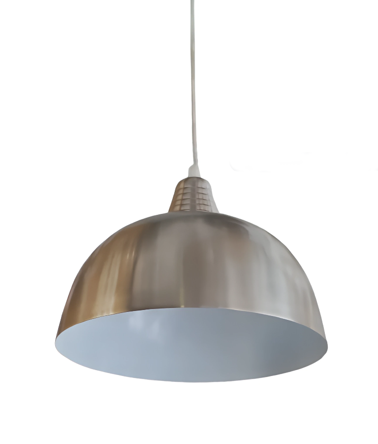 Colgante de 1 luz fabricado en acero, con tulipa de chapa tipo campana de 22 cm de diámetro. Su diseño simple y moderno lo hace ideal para iluminar y decorar espacios como cocinas, comedores o barras. Cuenta con altura regulable, permitiendo adaptarlo fácilmente a diferentes ambientes.