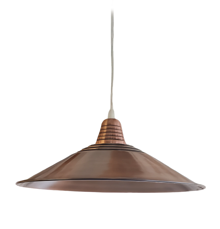 Colgante de 1 luz fabricado en cobre, con tulipa de chapa tipo campana de 22 cm de diámetro. Su diseño simple y moderno lo hace ideal para iluminar y decorar espacios como cocinas, comedores o barras. Cuenta con altura regulable, permitiendo adaptarlo fácilmente a diferentes ambientes.