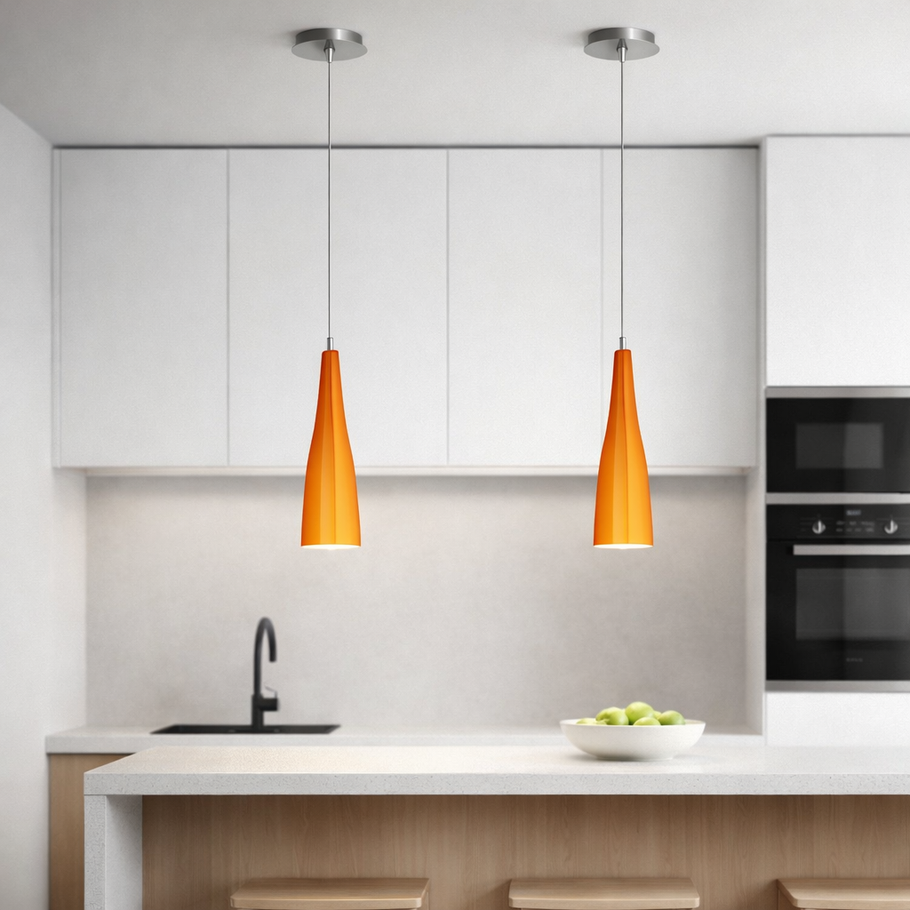 Colgante de 1 luz con tulipa de vidrio tubo trabajado en color naranja, ideal para aportar un toque moderno y decorativo al ambiente. Su diseño estilizado permite generar una iluminación cálida y destacar en espacios como barras, cocinas o mesas. Cuenta con altura regulable, adaptándose fácilmente a diferentes alturas de techo.