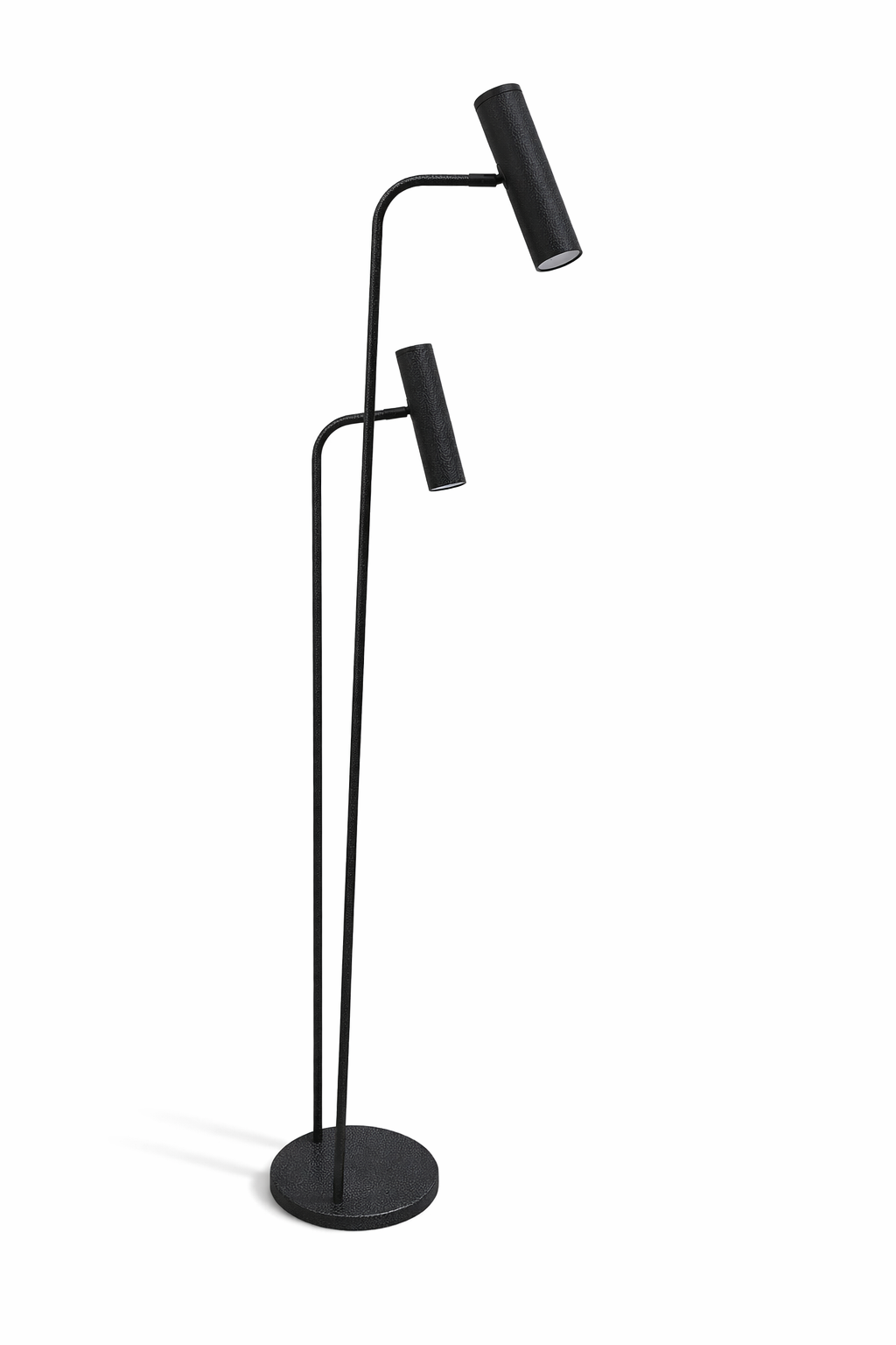Esta lámpara de pie de diseño moderno y minimalista se destaca por su estética limpia y funcional. Cuenta con dos spots cilíndricos orientables que permiten dirigir la luz de forma precisa, adaptándose a diferentes necesidades de iluminación.