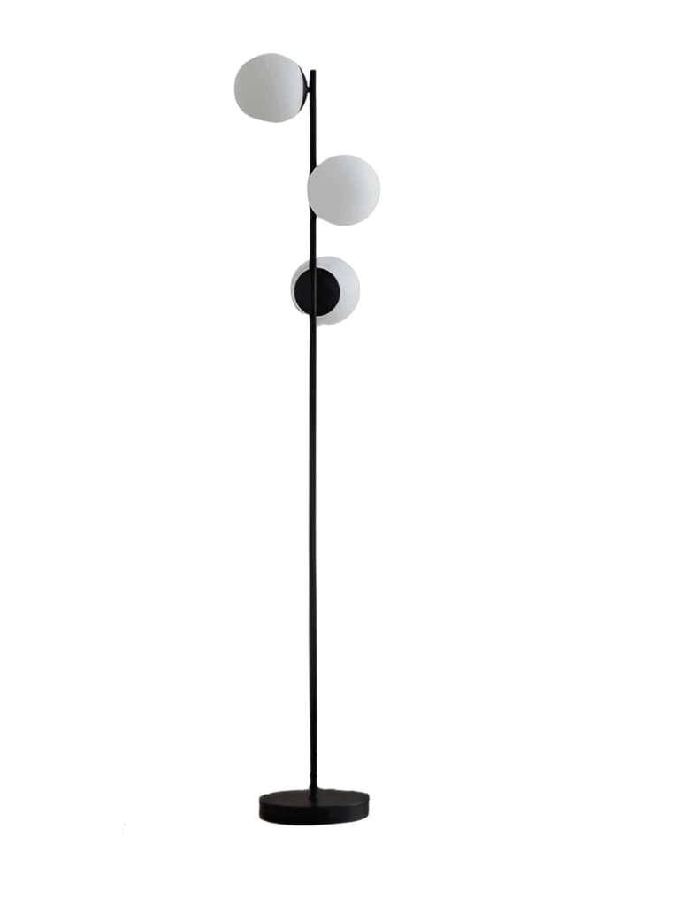 Lámpara de pie con diseño moderno y funcional. Su estructura telescópica permite ajustar la altura, mientras que la pantalla esférica metálica en negro con interior blanco ofrece una iluminación focal ideal para lectura o ambientes contemporáneos.