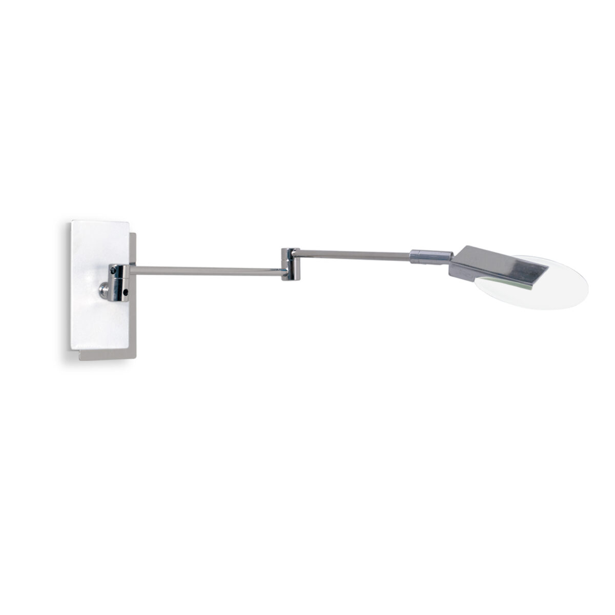Aplique articulado de diseño moderno con acabado blanco y detalles en cromo. Sus dos brazos móviles permiten direccionar la luz con precisión, ideal para lectura o iluminación puntual en espacios habitacionales.