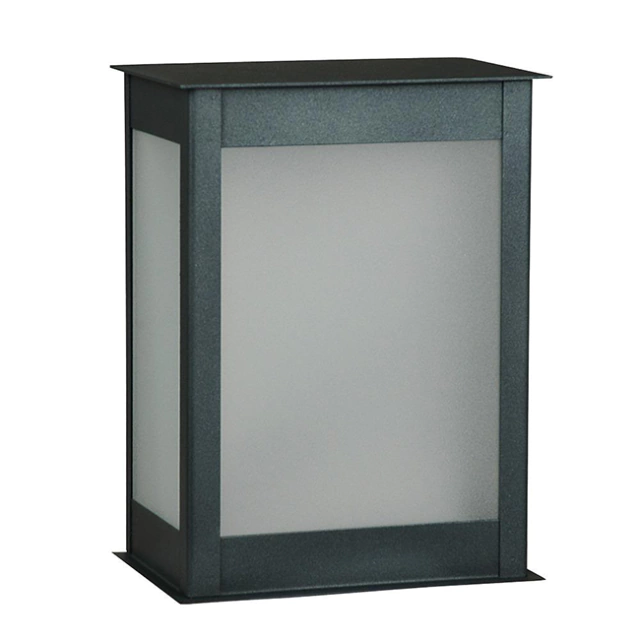 Aplique de exterior construido en chapa con vidrio arenado, apto para una lámpara E27. Diseño resistente, ideal para iluminar accesos, patios o galerías.