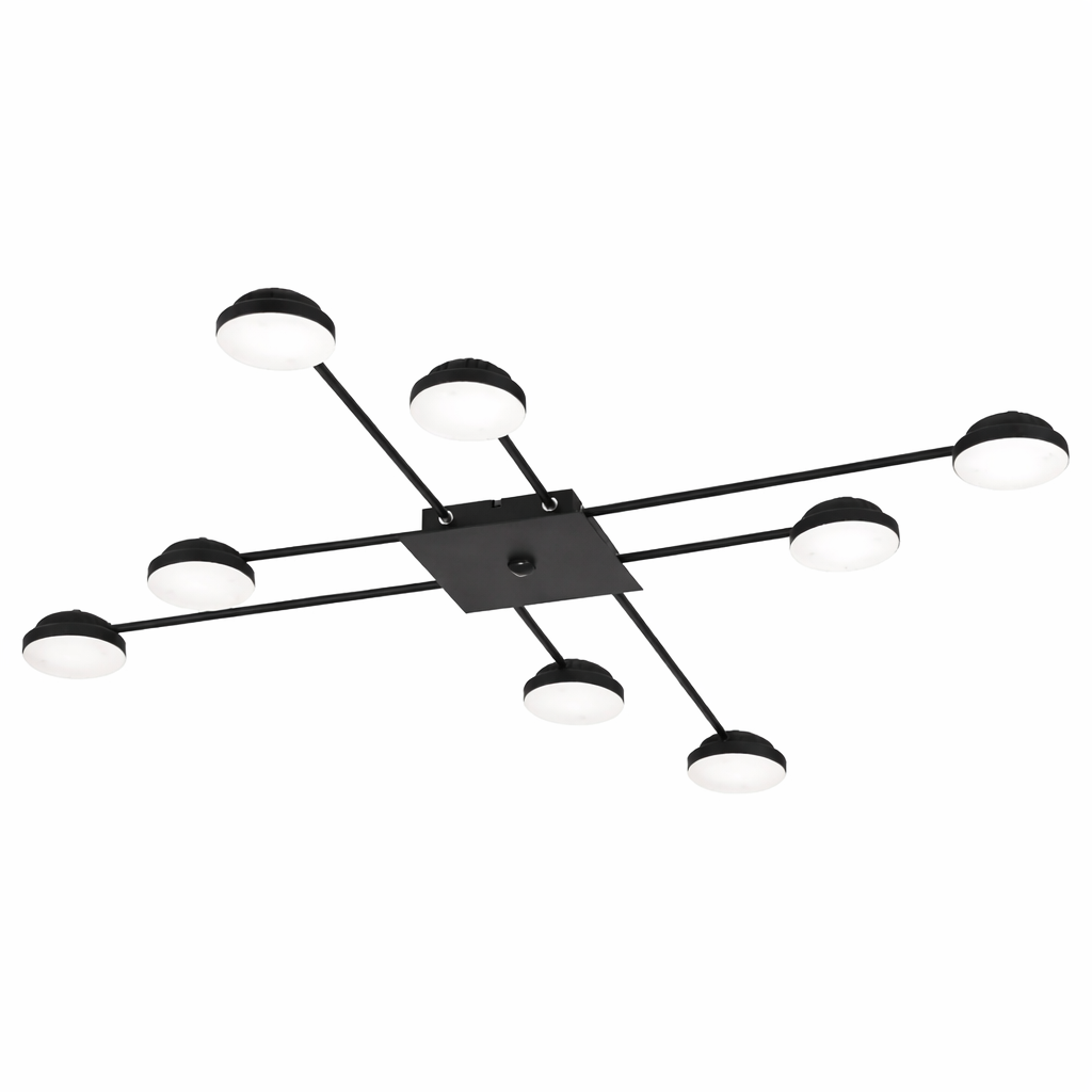Plafón de 8 luces LED con brazos y spots redondos fijos en sus extremos, ideal para lograr una iluminación amplia y moderna. Su base central cuadrada en color negro aporta un estilo contemporáneo que se adapta perfectamente a livings, comedores u oficinas.
