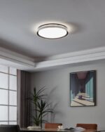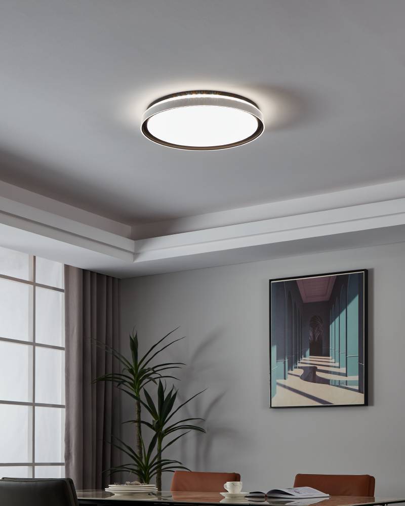 Plafón LED moderno de diseño minimalista, fabricado en acero con acabado negro. Su control remoto permite ajustar la temperatura de color (CCT) para crear diferentes ambientes: cálido, neutro o frío. Con 40W de potencia y un diámetro de 49 cm, ofrece una iluminación uniforme ideal para livings y salas de estar.