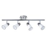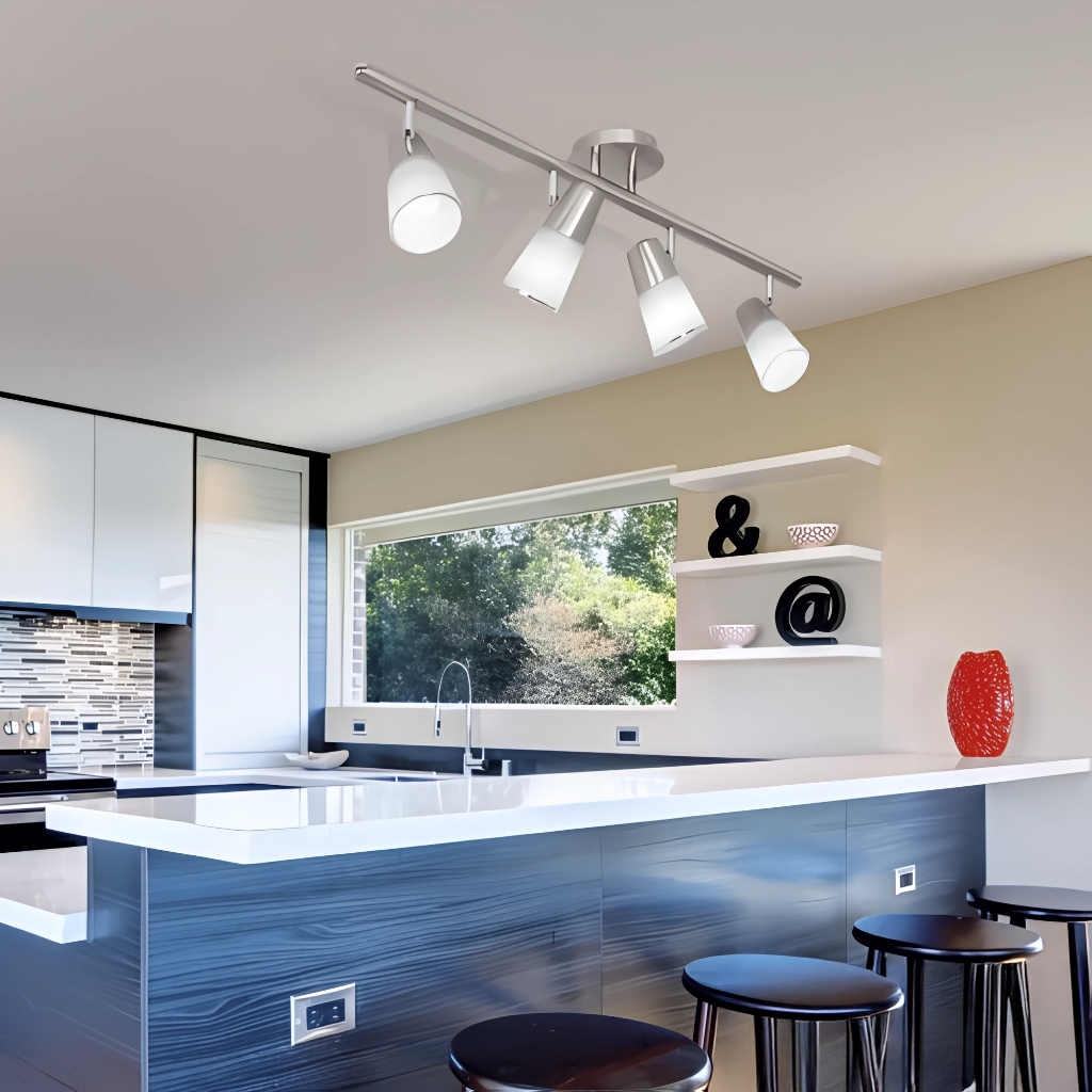 - Sistema de 4 luces en terminación cromo, ideal para iluminar ambientes amplios con estilo y funcionalidad. Cada luz incluye tulipas de vidrio satinado con detalle de virola cromada, logrando un diseño moderno, elegante y de excelente presencia.