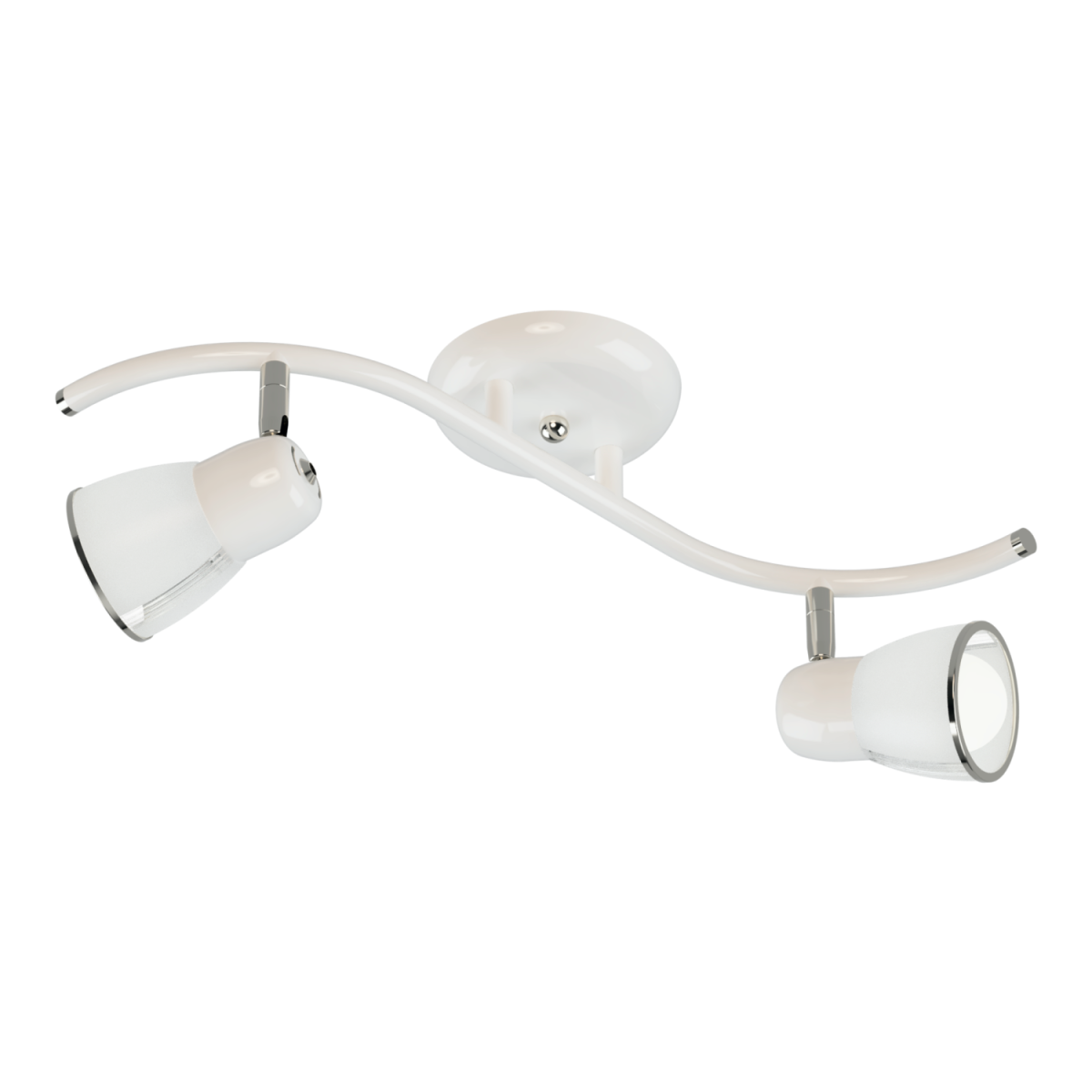 Plafón con estructura en forma de S, cabezales móviles y tulipas de vidrio con virola metálica, que permiten una iluminación versátil y ajustable.