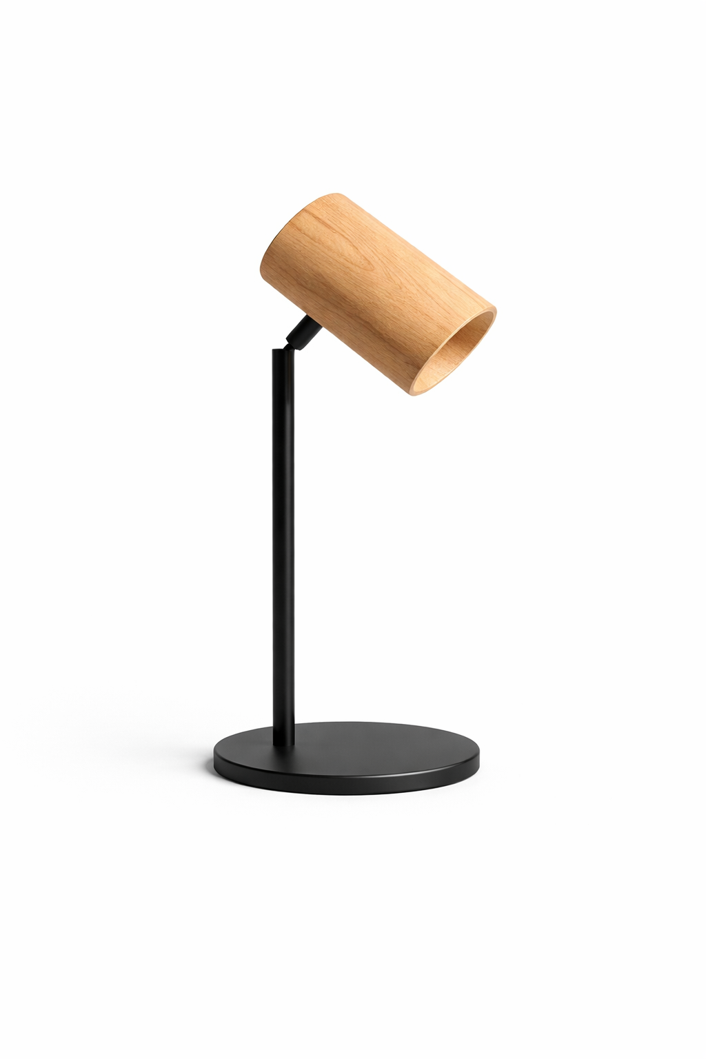Velador o lámpara de mesa/escritorio de diseño moderno y minimalista, ideal para sumar iluminación puntual con un toque decorativo. Su estructura metálica en color negro con pintura horneada garantiza durabilidad y una terminación de alta calidad. El cabezal cilíndrico de madera lenga aporta calidez al diseño y es direccional, permitiendo orientar la luz según la necesidad, ya sea para lectura, trabajo o iluminación ambiental. Perfecta para escritorios, mesas de luz o rincones de lectura.