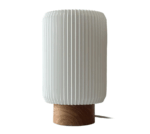 Velador de diseño limpio y contemporáneo, con cuerpo tubular en PLA blanco de 20 cm de diámetro y 35 cm de altura, sobre base de madera natural. Aporta calidez y estilo minimalista a cualquier ambiente. Ideal para lámparas decorativas E27.